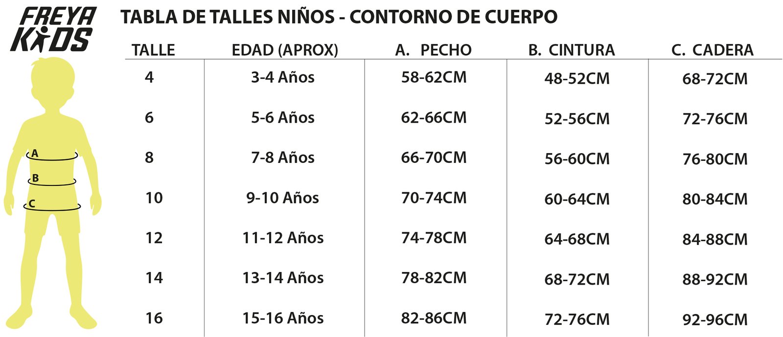 | TALLE | (A) TORAX | (B) CINTURA | (C) CADERA |